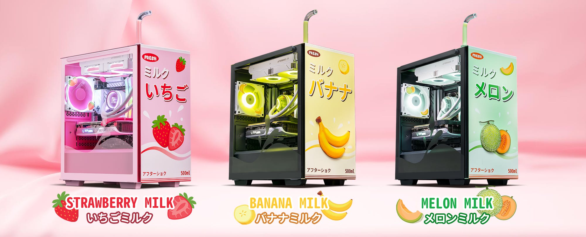 Drawing inspiration from vibrant and adorable Japanese fruit milk cartons, the PCs are available in three delightful flavours: Strawberry, Melon and Banana. We've designed each PC variations with the same design language, capturing the uniformity of the conventional milk cartons. Each flavour is branded with a custom made acrylic at the front, and a 'nutritional label' at the back.